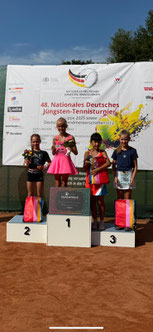 Einen unglaublich tollen Erfolg in ihrer noch jungen Tenniskarriere hat unsere Spielerin Valentina Hoffmann gefeiert: Sie hat beim 48. Nationalen Deutschen Jüngsten-Tennisturnier in Detmold, das als wichtigstes Nachwuchtsurnier in Deutschland gilt, den zweiten Platz bei den Juniorinnen U9 geholt. Hier standen schon Boris Becker, Steffi Graf, Thomas Haas, Angelique Kerber, Sabine Lisicki und Alexander Zverev auf dem Treppchen und die AK U12 wird sogar als Deutsche Jugendmeisterschaft ausgetragen. Valentina gewann zunächst all ihre drei Gruppenspiele souverän und spielte sich damit - wie bereits im Vorjahr als achtjährige- in die Hauptrunde. Dort schlug sie zuerst Luisa Bonorden vom TC Ludwigsburg 6/2 6/2 und im Viertelfinale Katharina Lux vom TC Schriesheim aus Baden mit 6/3 6/2. im Halbfinale wartete mit Emmy Muyao Zhu vom TC Schwarz-Gelb Heidelberg eine schwere Hürde, die Valentina mit 6/4 7/6 bezwang. Im Finale war dann die extrem stark spielende Leni Löchter vom TC Grün-Weiß Bochum zu stark und Valentina unterlag 3/6 2/6. Eine herausragende Leistung, die auch in die Vereinsgeschichte von Weiss-Blau eingeht. Wir sind gespannt, wo der Weg von Valentina sie noch hinführt und möchten sie in Zukunft dabei begleiten.